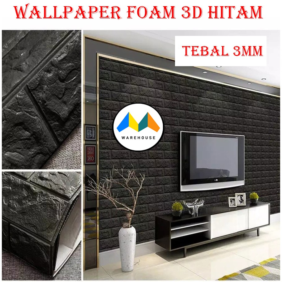 MW Wallpaper Foam Hitam Bata 3D Bata Warna Hitam Premium Wall Paper Sticker Tebal 3MM